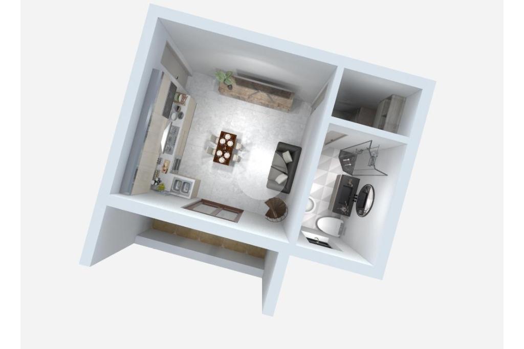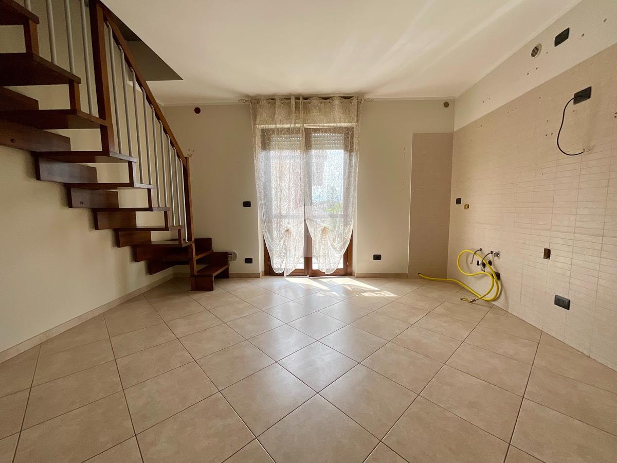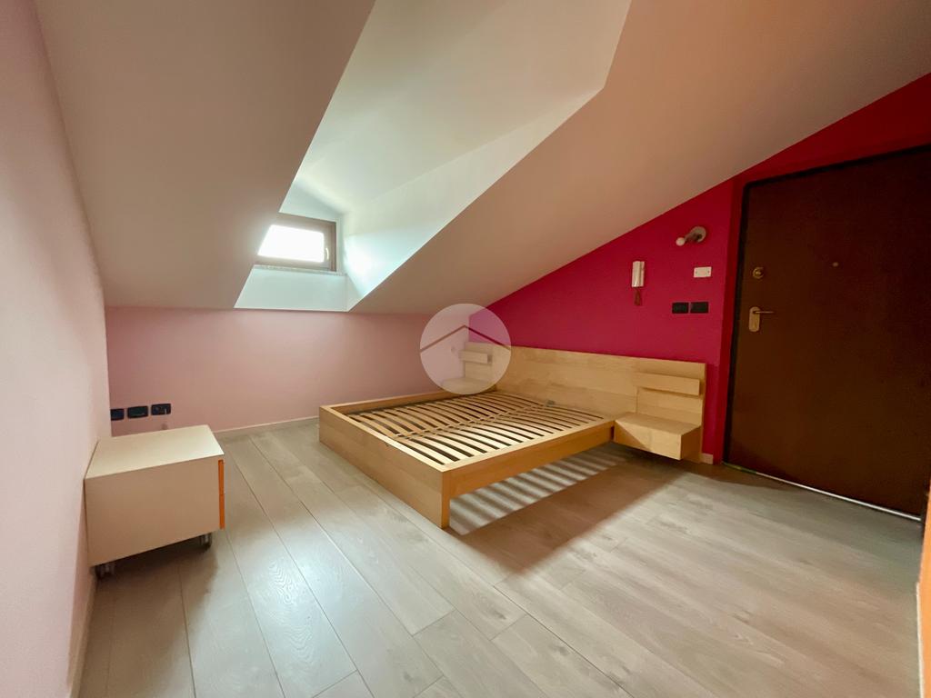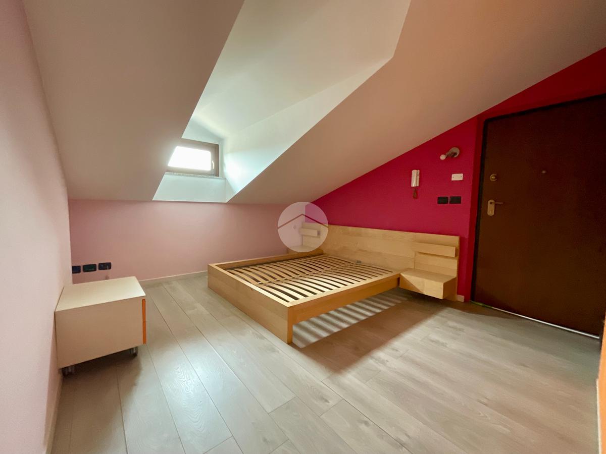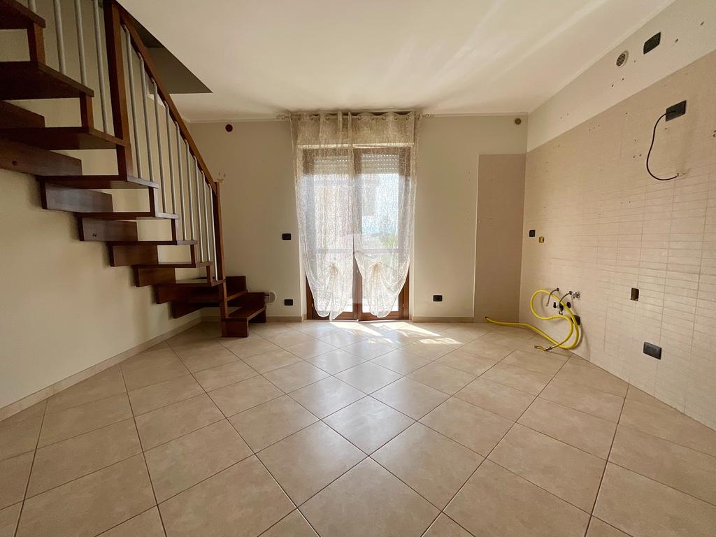 Dal soggiorno, una scala interna conduce al piano superiore dove si trovano una camera da letto con finestra e uno studio. La mansarda è accessibile anche tramite la scala condominiale esterna.