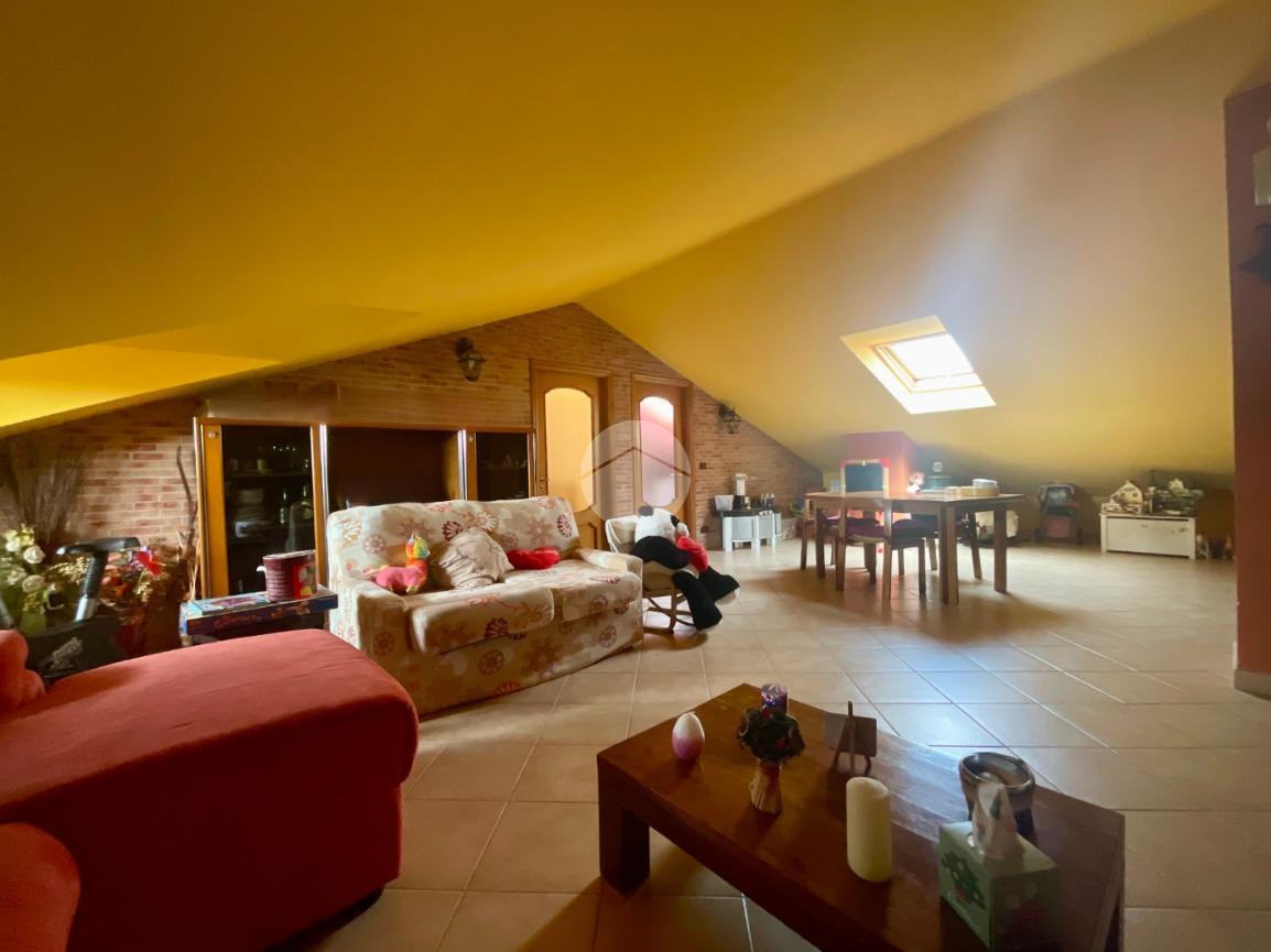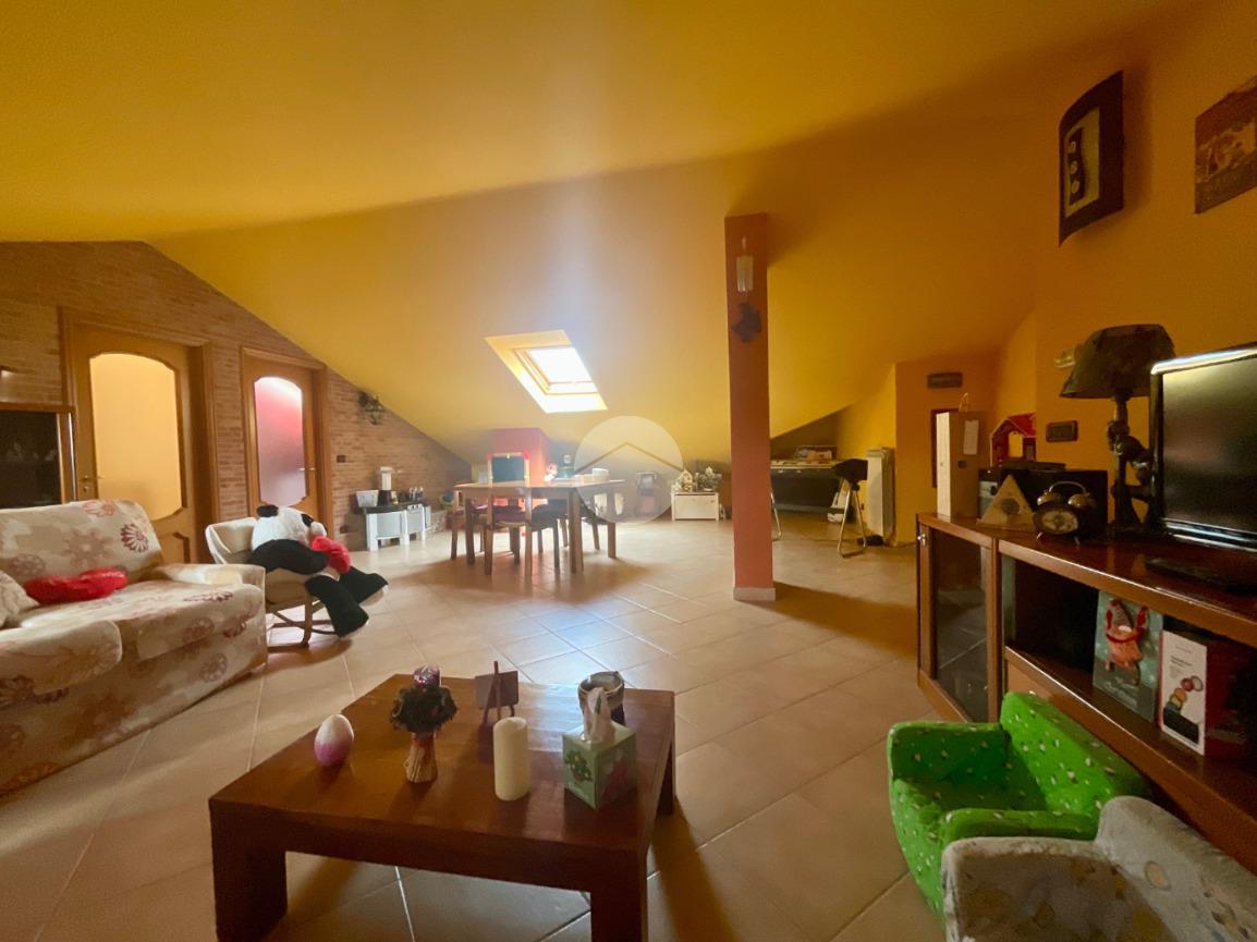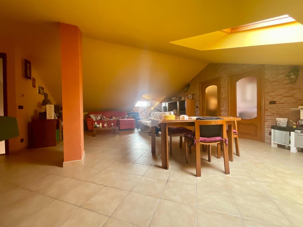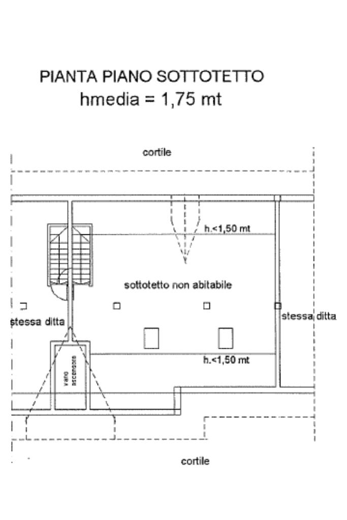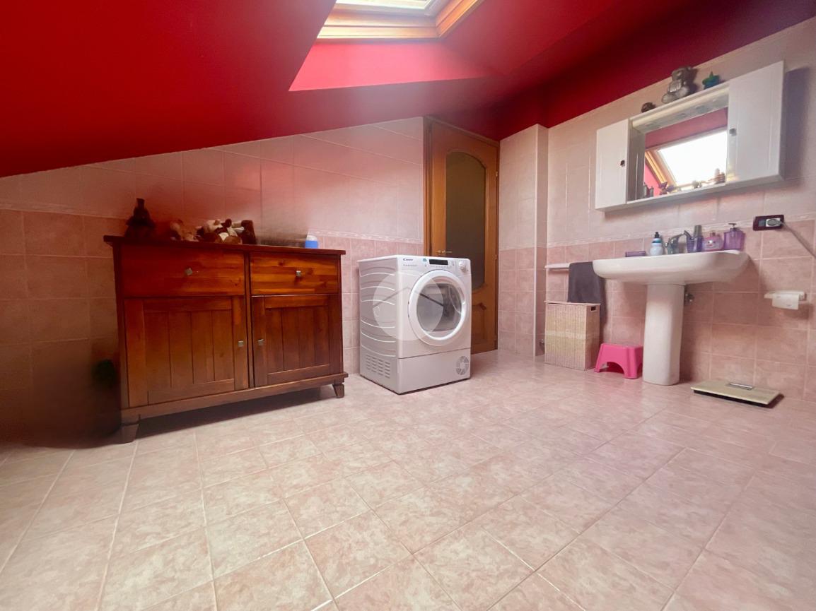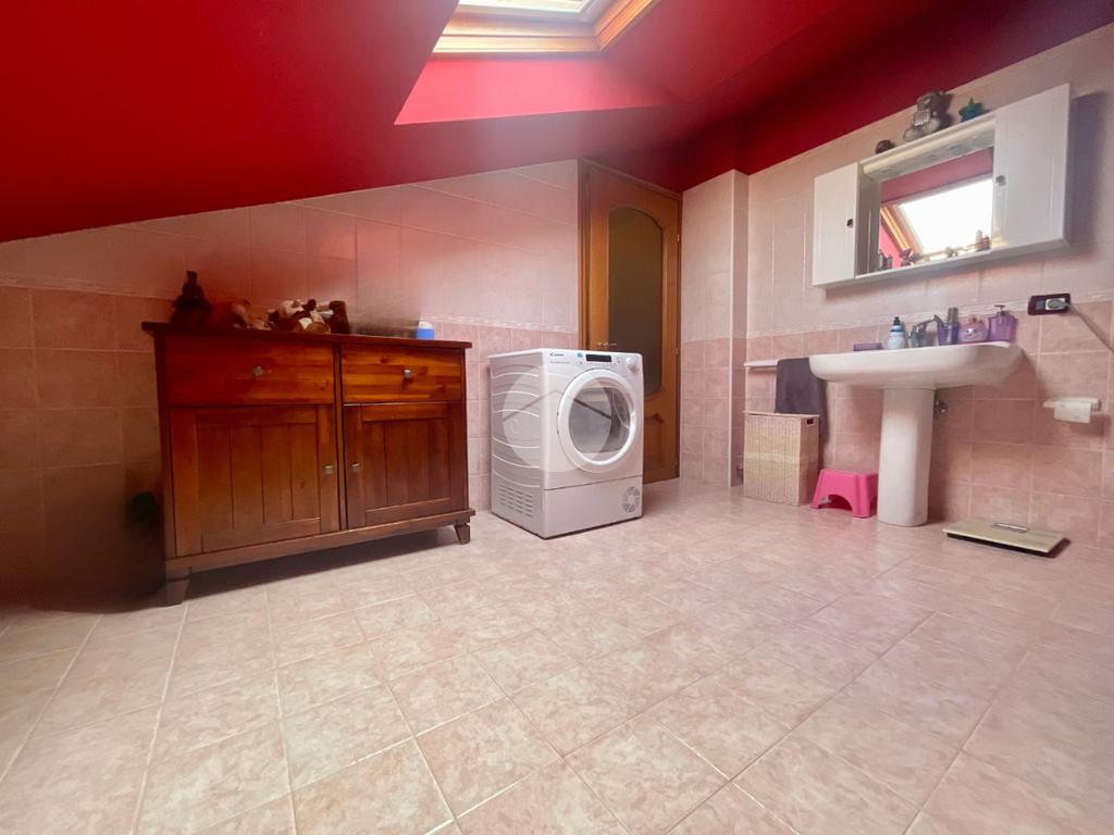 Dal soggiorno si accede, tramite una scala in ferro battuto con pedate in legno, al piano mansardato. Questo si presenta come un ampio open-space in cui sono stati ricavati una cameretta e un bagno finestrato, dotato di vasca, sanitari e attacchi per la lavatrice. Il piano è ben illuminato grazie alla presenza di abbaini che garantiscono anche un ottimo ricircolo d’aria.