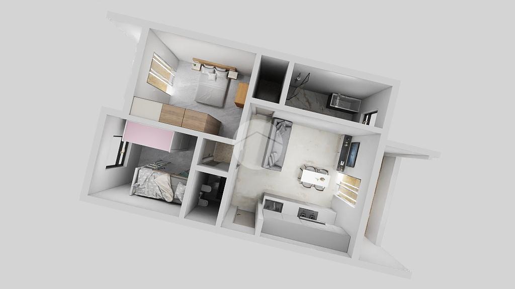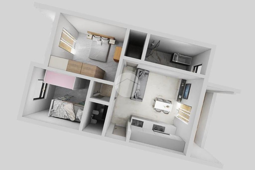 Ampio ingresso living con parete cucina attrezzata a vista. L'ambiente è reso estremamente luminoso da una porta finestra che conduce al terrazzo, spazio ideale per pranzi all'aperto e momenti di relax. La zona notte è composta da due camere da letto una con finestra, l’altra con accesso diretto a un balcone tramite porta finestra.