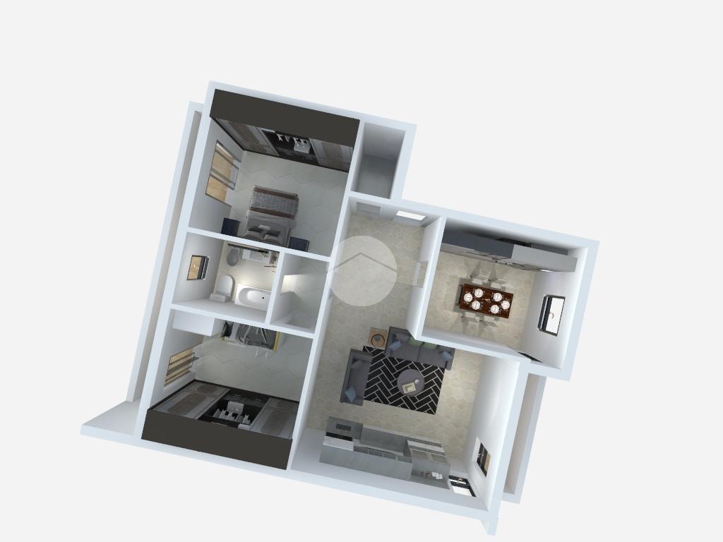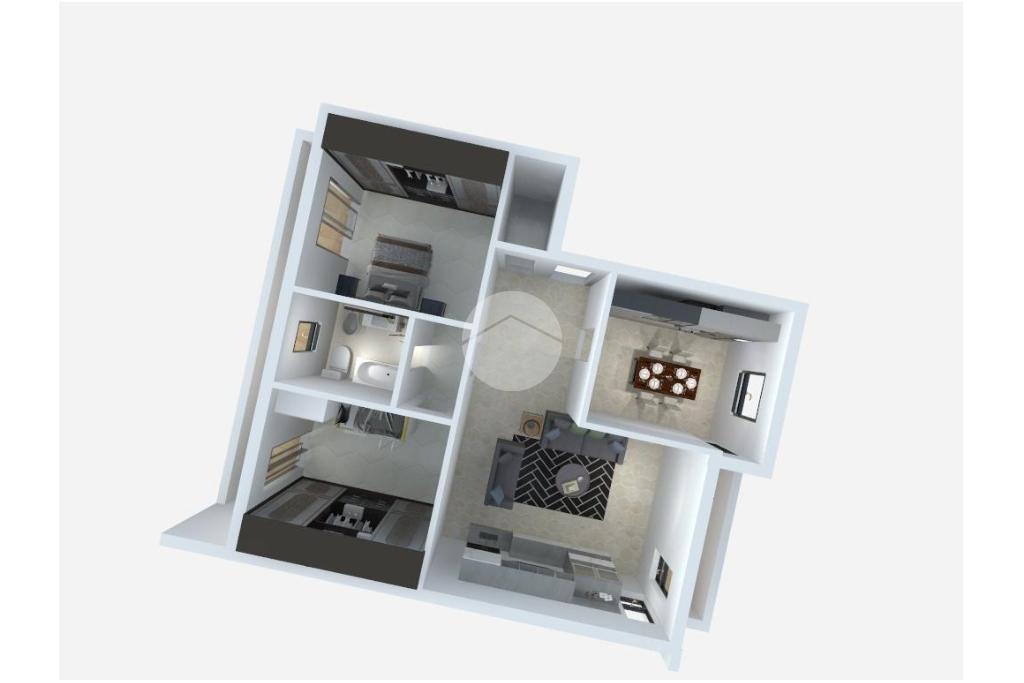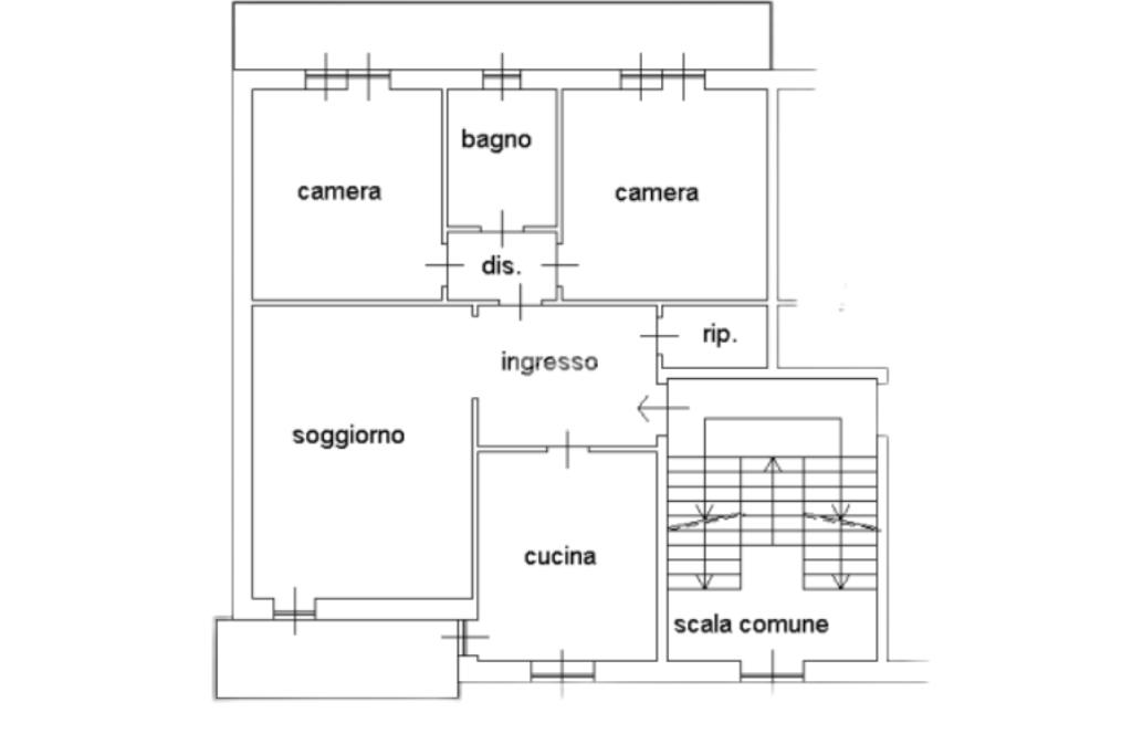 Un comodo disimpegno separa la zona giorno dalla zona notte, composta da due spaziose camere da letto, entrambe provviste di finestra e porta finestra con accesso a un balcone con affaccio sul cortile condominiale. Il bagno, finestrato, è completo di sanitari, vasca e doccia.