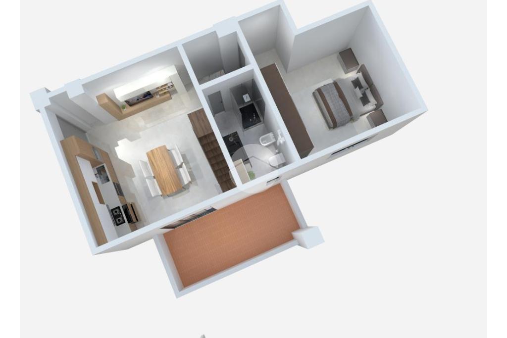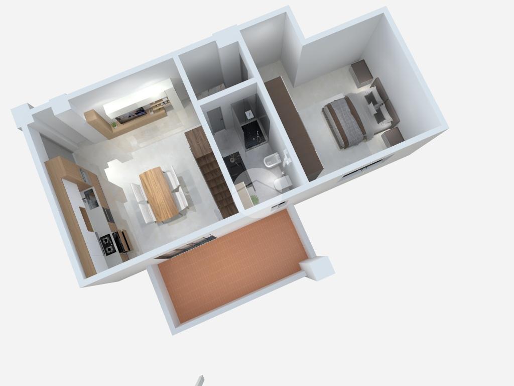L’ingresso è su una luminosa cucina abitabile, arricchita da una porta finestra che consente l’accesso al terrazzo con affaccio sul cortile interno. Un pratico disimpegno conduce alla camera da letto matrimoniale finestrata e al bagno, anch’esso finestrato, completo di box doccia e predisposizione per la lavatrice.