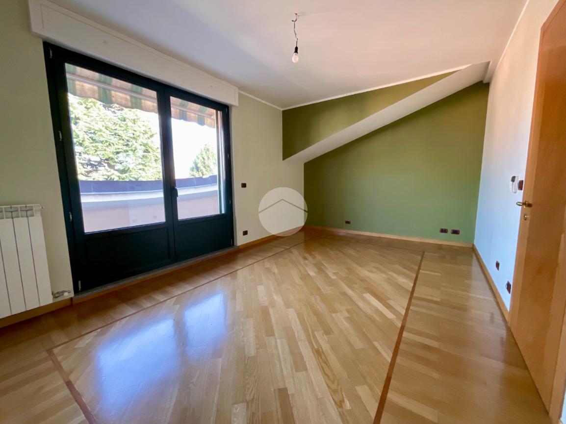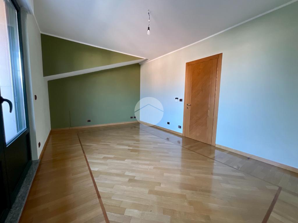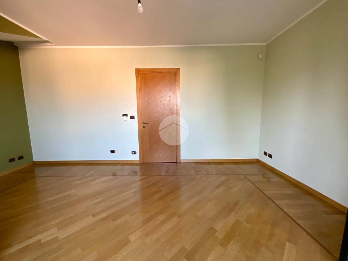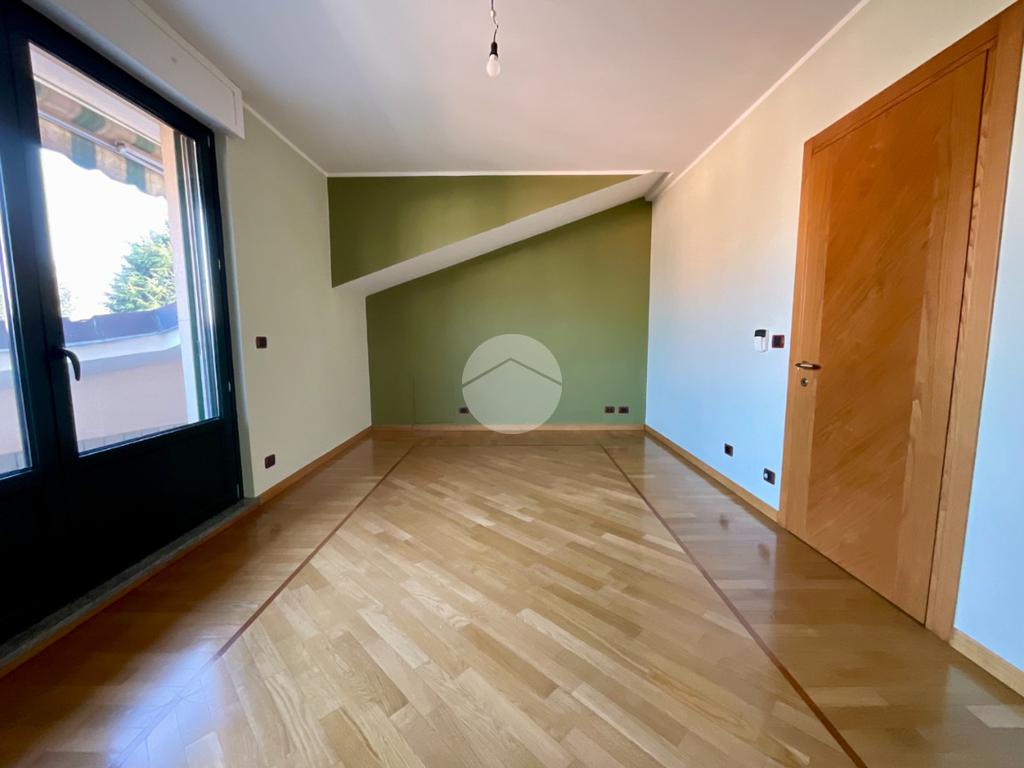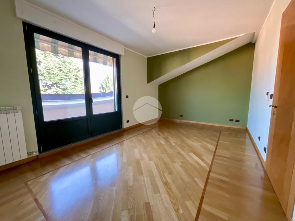 Al primo piano troviamo un ampio soggiorno doppio, caratterizzato da tre finestre con apertura vasistas motorizzata e da due porte finestre che permettono l’accesso al balcone con affaccio sul giardino privato. Dal disimpegno si accede a una stanza con portafinestra affacciata, nella quale sono già predisposti gli impianti per un’eventuale cucina, oltre a un ampio bagno finestrato con sanitari sospesi e doccia.